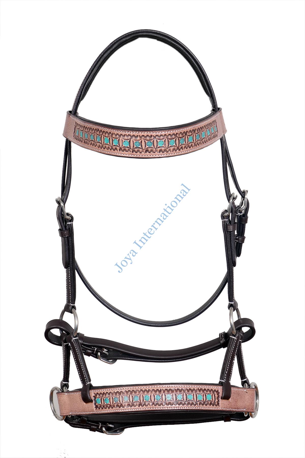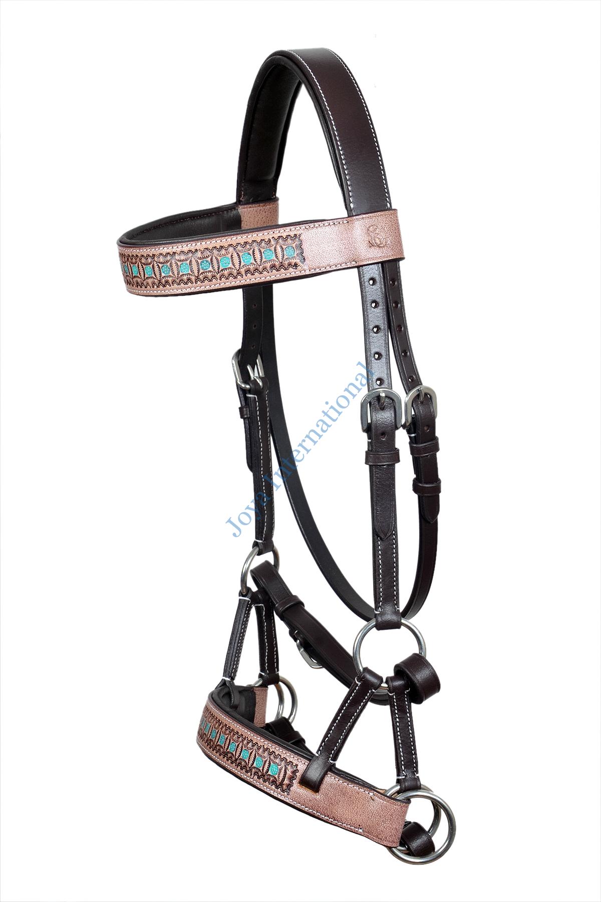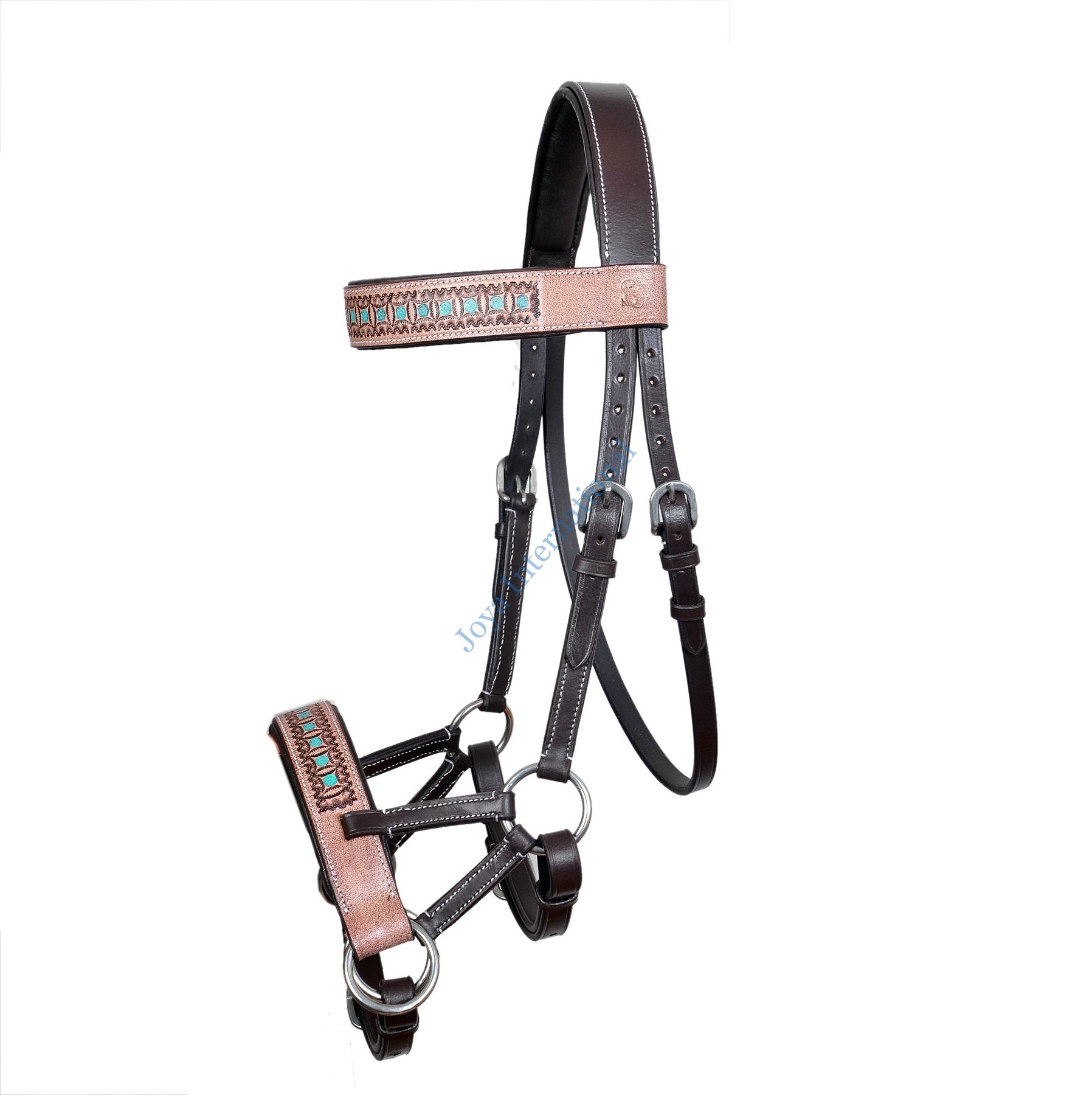 Introducing the Joya International Handmade Antique Floral Tooled Bitless Sidepull Bridle, a perfect blend of craftsmanship and Western style for your beloved horse. This exquisite bridle is crafted from premium vegetable-tanned leather, ensuring durability and a timeless aesthetic. The intricate hand tooling on the noseband and browband features a stunning sunflower and leaf design, adding a touch of elegance to your horse’s ensemble. The vibrant green color not only complements the floral patterns but also adds a unique and eye-catching element to the overall look. Designed for comfort and functionality, this bitless sidepull bridle provides a gentle and effective means of communication with your horse. The absence of a bit makes it an excellent choice for horses that prefer bitless options, ensuring a more natural riding experience. Equipped with stainless steel hardware, this bridle not only enhances its durability but also adds a touch of modern sophistication. The high-quality craftsmanship ensures that each detail is meticulously executed, making it a standout piece in any Western riding setting. Upgrade your riding experience with the MEWATI Handmade Antique Floral Tooled Bitless Sidepull Bridle – a perfect fusion of artistry, comfort, and functionality for both you and your horse. Order yours today and embark on a journey of style and connection with your equine companion