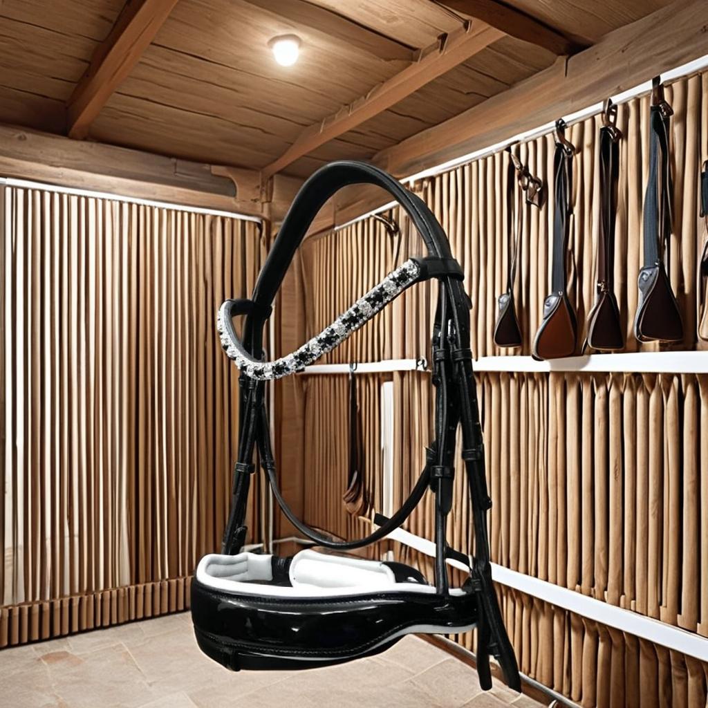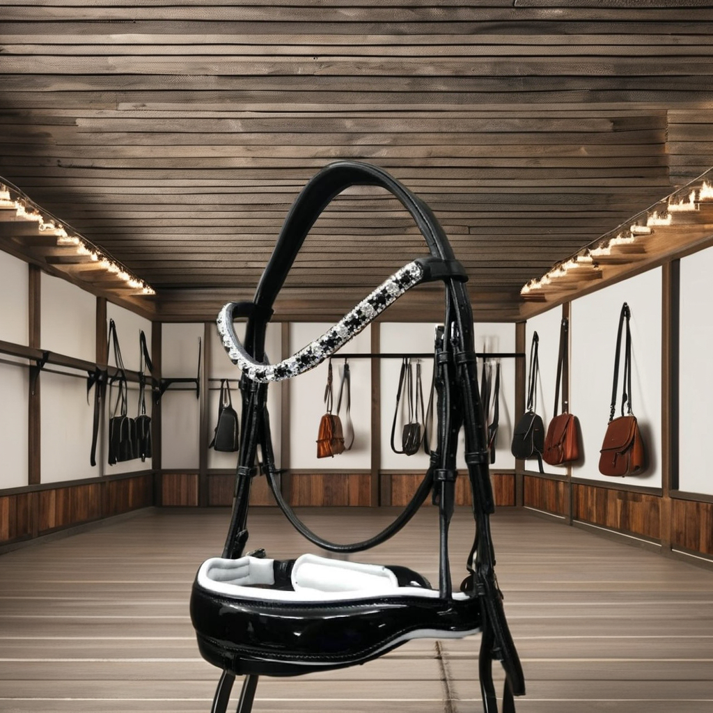 The stunning black and white crystal browband adds a touch of sparkle, giving this bridle a refined and professional look — perfect for both training and competition.