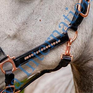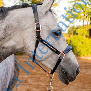 Luxury leather halter from the show-time collection with Rose gold sides are finished with Rose gold stones on the head collar.